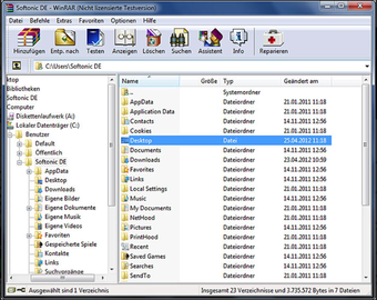 Die wichtigsten Funktionen von WinRAR sind aus der oberen Leiste auf der Oberfläche leicht aufzurufen: Assisten, Virus-Scan, die Funktion zum Hinzufügen und Entfernen von Dateien sowie selbstextrahierende Archive erstellen.